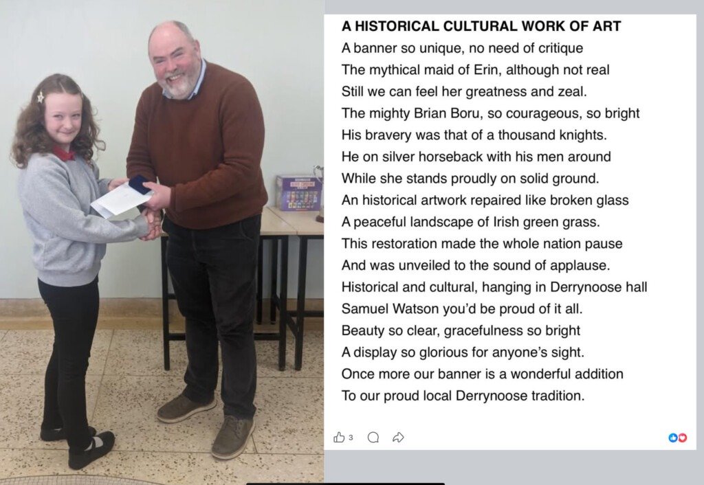 Congratulations to Alix in P6 who came 2nd in the Monsignor Murray Poetry Competition. The children were asked to write about a key historical event or place of local interest. Alix’s poem tells the story of the recently refurbished Derrynoose Heritage Group Derrynoose Banner. A super poem that can be viewed below. Many thanks to Mrs Hamilton for guiding the children in preparation for writing their poems.