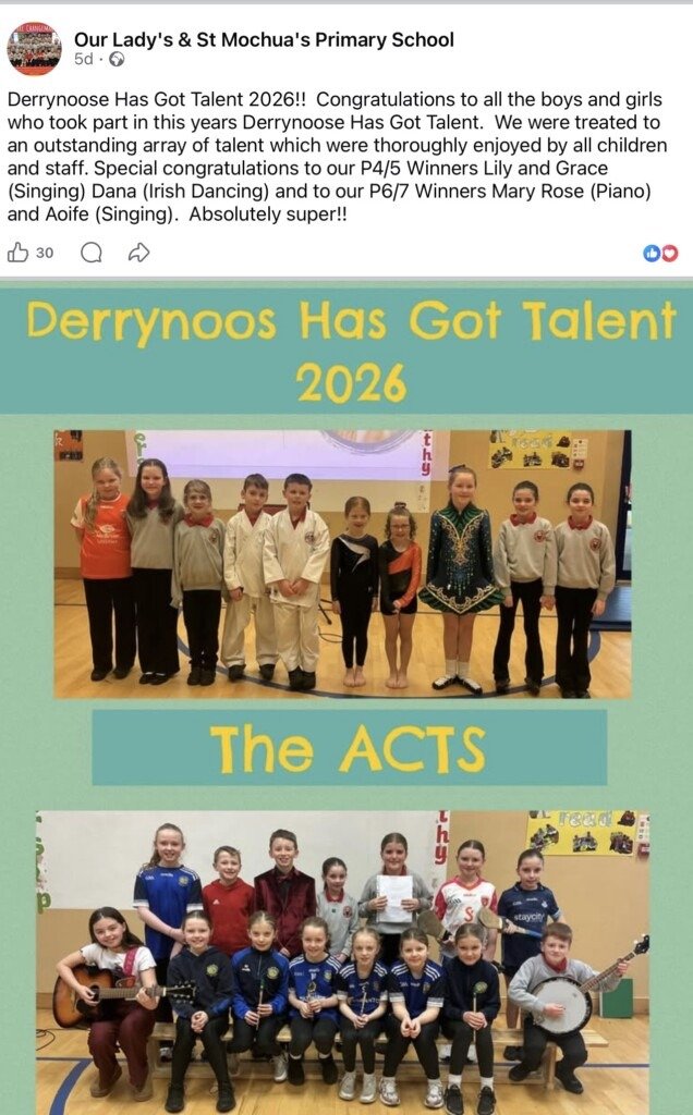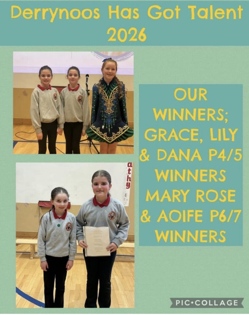 Derrynoose Has Got Talent 2026!! Congratulations to all the boys and girls who took part in this years Derrynoose Has Got Talent. We were treated to an outstanding array of talent which were thoroughly enjoyed by all children and staff. Special congratulations to our P4/5 Winners Lily and Grace (Singing) Dana (Irish Dancing) and to our P6/7 Winners Mary Rose (Piano) and Aoife (Singing). Absolutely super!!