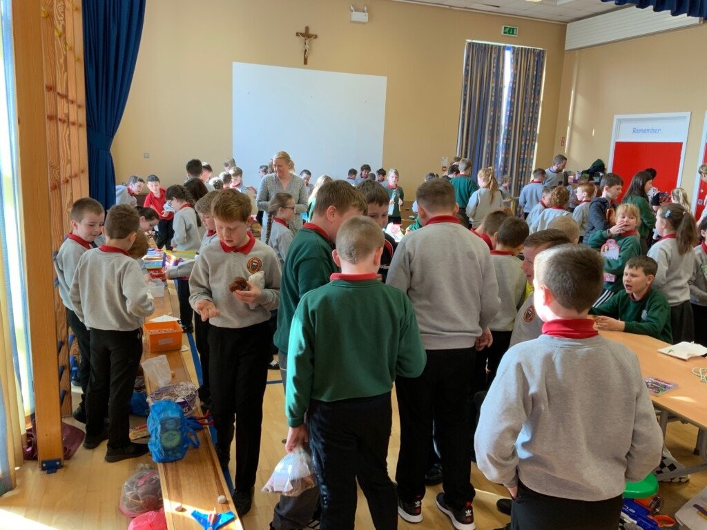 The children are allowed to bring in items from home that they can either sell or swop. In addition they can bring in a small sum of money that they can use to purchase items. Each child gets a stall to lay out their items. Once this is completed the trading bell will ring for the first time. This allows the children time to go round and view other items but no bartering, negotiating or deal making is allowed during this period. This session allows the children time to think about things they might like and ensures that they don’t make decisions that they might later regret. When the second bell rings this signals the start of the trading session. See below;
